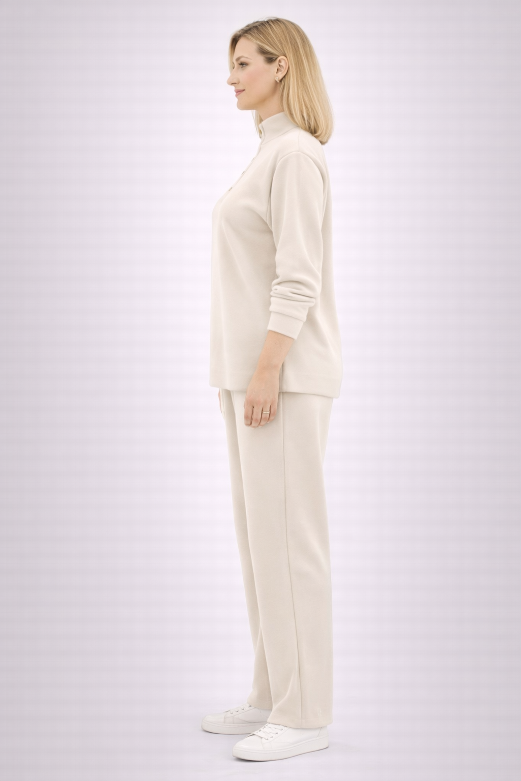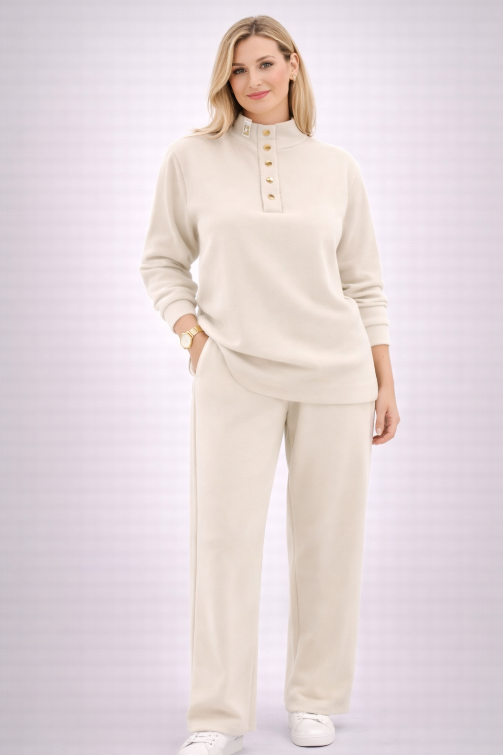 Bluza, cu guler înalt și închidere parțială cu nasturi decorativi, adaugă un aer sofisticat și modern. Croiala lejeră se așază frumos pe siluetă, oferind libertate de mișcare și un look relaxat, perfect pentru purtare zilnică.